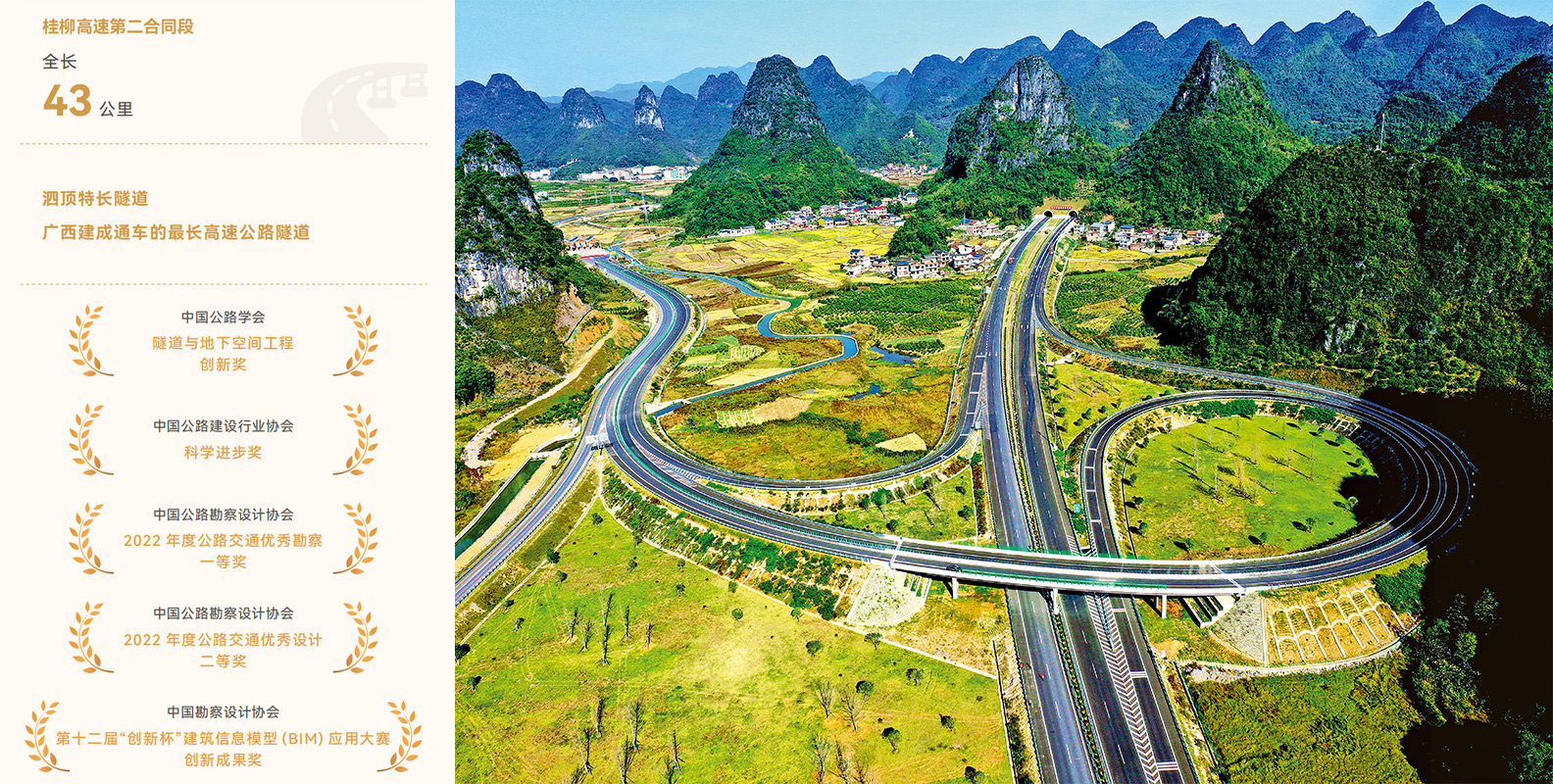 桂柳高速第二合同段(桂林市古豪村至柳州市融安縣紅嶺村段)全長 42.895 公里,其中泗頂特長隧道是目前廣西建成通車的最長高速公路隧道,也是廣西第一個設置斜井的高速公路隧道。該項目路段地質條件復雜,泗頂特長隧道隧址為典型的巖溶峰叢地貌,隧址區內地下水豐富,巖溶裂隙發育,巖體破碎,是全線隧道克難攻堅戰中最重要的“卡脖子”工程。公司進行多方案比選論證,組織專家團隊現場勘察,并進行多次評審論證,在前期設計階段有效繞開了溶洞、地下暗河等不良地質,高質量完成了設計任務;在隧道施工過程中,組織技術骨干成立設計代表組,長期駐守施工現場,及時解決和指導施工過程中遇到的問題,解決多次大型巖溶突水事件,為隧道順利貫通提供技術保障。