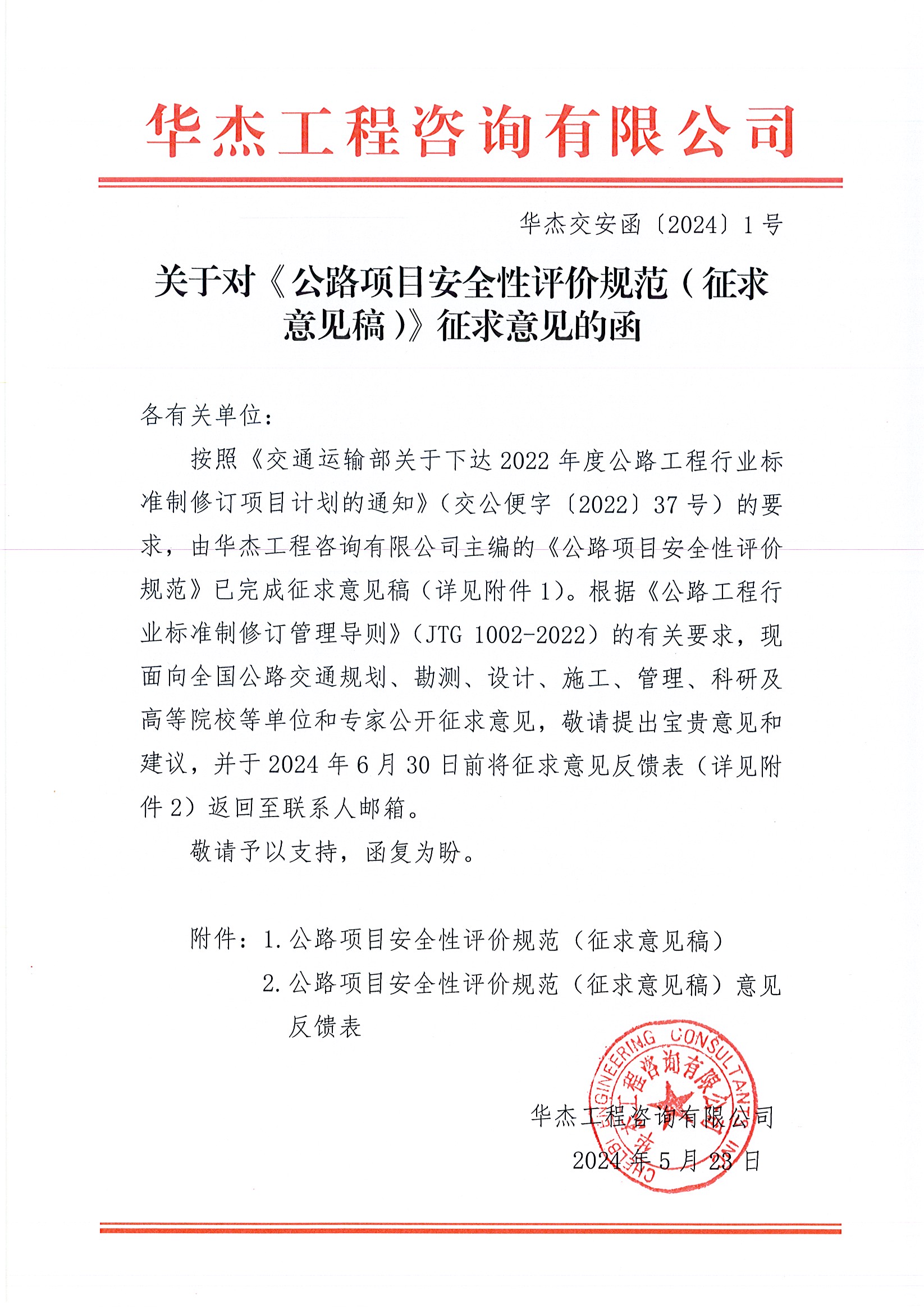 關于對《公路項目安全性評價規范(征求意見稿)》征求意見的函
